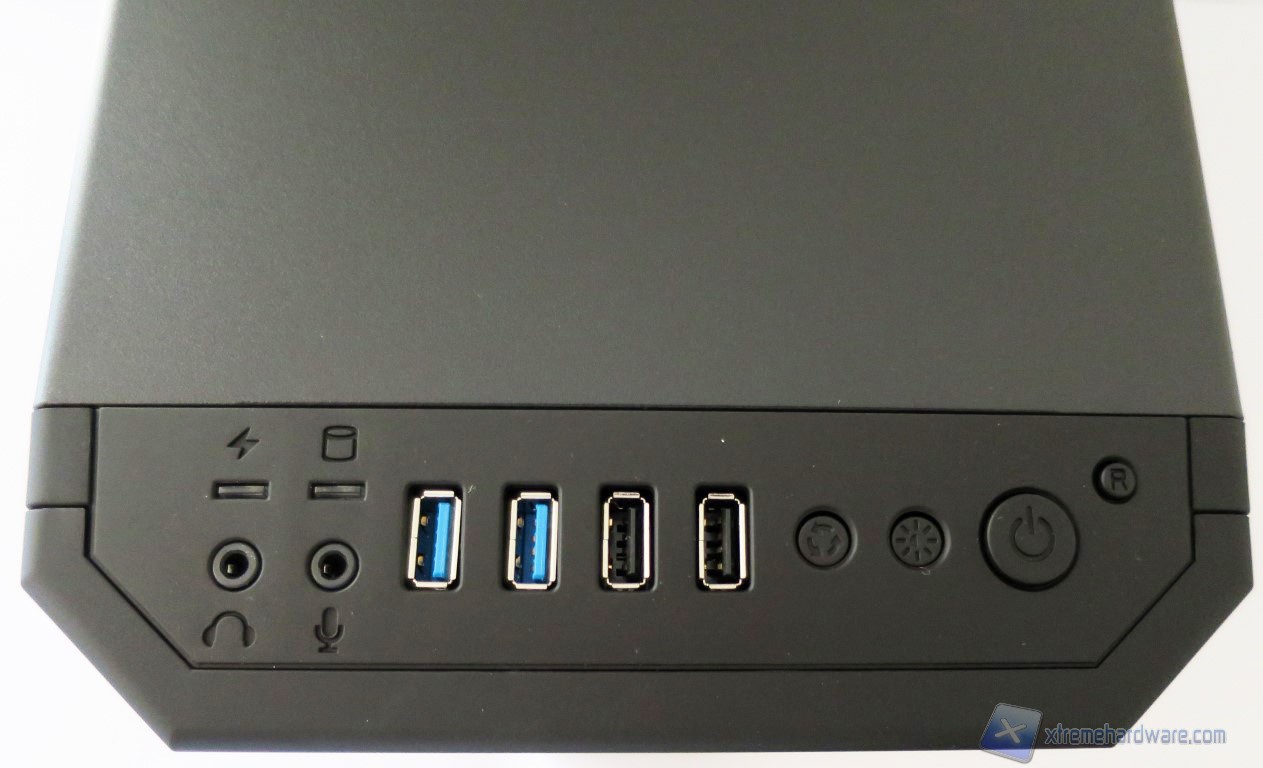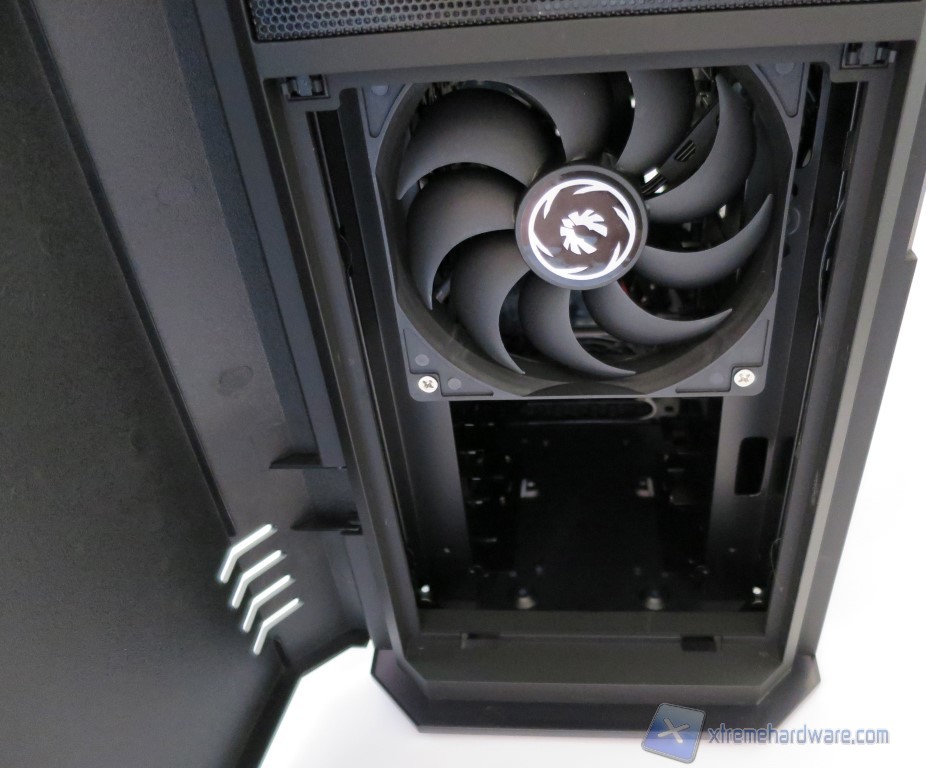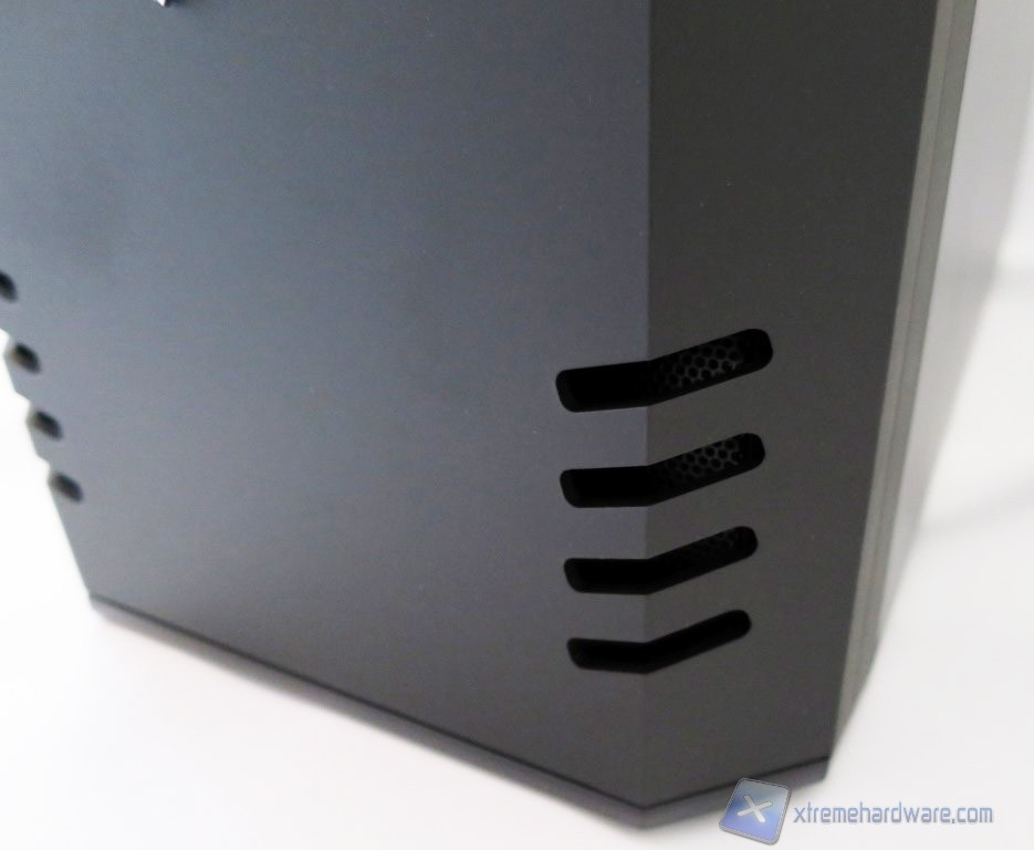 Il frontale del BitFenix Shadow è rivestito di una superfice Soft Touch molto bella al tatto ed alla vista. Spostandoci leggermente verso il basso possiamo notare il classico logo BitFenix in risalto ed ai lati alcune feritoie che sembrano le branchie di uno squalo, questo per rendere più aggressivo ma non meno elegante il BitFenix Shadow. La loro funzione principale è permettere il passaggio di aria fresca alle retrostanti ventole da 120mm. Il colore del frontale è completamente nero opaco, come per molti altri case dell’azienda taiwanese. Notiamo inoltre come il pannello frontale sia solo una semplice protezione per le unità da 5,25 pollici e per la griglia delle ventole: infatti, ci basterà aprire lo sportello/pannello per accedere al vero frontale composto da una griglia a più inserti per l’installazione di unità da 5,25 pollici. Tali griglie sono dotate di comodi filtri antipolvere. La griglia inferiore, dotata di filtro antipolvere in spugna per due ventole da 120mmm, si rimuove con due semplici click, premendo semplicemente verso l’interno. Questo perché la griglia è dotata di due fermi agganciati a due supporti nella parte interna del case. La rimozione e la pulizia del filtro è pertanto molto semplice. Dietro tale griglia si cela la ventola da 120 millimetri preinstallata ed è possibile montare un’ulteriore ventola, sempre da 120 millimetri. Analizzando la parte top/frontale troviamo le connessioni USB ed i vari pulsanti. Nel dettaglio troviamo partendo da sinistra le spie attività del PC e del nostro Hard Disk, due porte USB 3.0, due porte USB 2.0, il tasto per cambiare colore ai LED, il tasto per spegnere l’illuminazione a LED, il classico tasto per l’accensione e per finire quello del Reset. La parte superiore del BitFenix Shadow, invece, non presente aperture o griglie per l’installazione di radiatori o ventole aggiuntive nella parte alta del case.