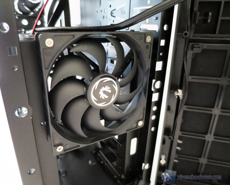 Il retro del BitFenix Shadow ha una disposizione classica con l’alimentatore nella parte bassa del case e la scheda madre nella parte alta. Nel dettaglio, troviamo partendo dall’alto la griglia per la ventola da 120 millimetri (pre-installata) con a lato il foro per l’installazione della mascherina I/O della scheda madre e poco più sotto due fori, non gommati, per il passaggio di tubi per un eventuale impianto a liquido. Facciamo una piccola precisazione che riguarda appunto l’impianto a liquido. Come per Il BitFenix Neos anche il BitFenix Shadow seppur dotato di tali fori per un’installazione esterna di radiatori non permette viste le dimensioni interne di montare un impianto a liquido. Unica soluzione se si volesse utilizzare il BitFenix Shadow con una configurazione a liquido sarebbe quella di realizzare una waterstation esterna in cui tutti i componenti principali sono appunto montati esternamente ma a nostro avviso tale case non è adatto neanche in questa configurazione ipotetica. Detto questo procediamo nell’analisi della parte posteriore. Sotto i due fori troviamo 7 slot. In questo caso si è scelto di utilizzare slot PCI perforati quindi potrebbe essere presente il fenomeno del “negative loop” orizzontale, tale per cui le temperature della scheda grafica possono aumentare a causa del potenziale ricircolo di aria calda dall’esterno. Ciò si verifica quando c’è un fenomeno di pressione negativa, ovvero sbilanciamento tra ventole in estrazione e in immissione, in favore delle prime. I 7 slot sono inoltre tenuti saldamente nella parte terminale da una cover in metallo con relativa vite nel mezzo. Per finire troviamo il foro per l’installazione di un alimentatore ATX.