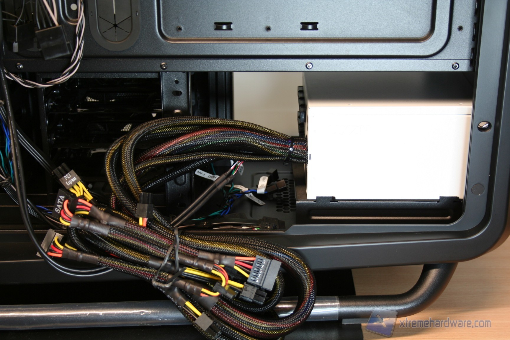 In questo paragrafo analizzeremo velocemente il montaggio di un sistema Intel all’interno del Comos II ed il conseguente cablaggio posteriore ed anteriore. Anche per gli utenti poco esperti la procedura è molto facile: per prima cosa dovrete montare l’alimentatore alla base del cabinet, facendo attenzione a passare il connettore di alimentazione supplementare della scheda madre, da 4/8 pin, attraverso l’apertura laterale destra, quindi facendolo scomparire e passare dietro alla paratia d’installazione della scheda madre, per permetterne il passaggio dal foro superiore sinistro (guardandolo lateralmente). Potrebbero essere necessarie delle prolunghe per il connettore CPU 4+4 pin e per il connettore della scheda madre.