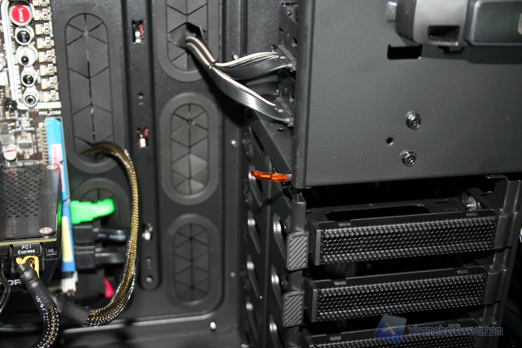 Fatto questo, e bloccato il lettore tramite il sistema di blocco laterale, si richiude il pannello frontale e si passa all’installazione della scheda madre. Se si possiede un dissipatore Intel, tramite il solito sistema push-pin, sarà possibile installarlo successivamente, altrimenti se volete potete già procedere ad installare il backplate del dissipatore della CPU, facendo attenzione a stendere un sottile velo di pasta termica alla base della CPU stessa. In sostanza, se la vostra scheda madre non è mini-ITX, dovrete prima montare i distanziatori nei fori per il formato ATX, serrarli molto bene – consigliamo una pinza larga 1cm durante quest’operazione, su ogni cabinet – e poi apporre la scheda madre, serrandola con le viti fornite nella confezione. Se avete un dissipatore aftermarket potete utilizzare il foro posteriore, che è molto pratico e vi aiuterà non poco all’atto della procedura. Dopo aver montato il dissipatore sulla scheda madre, sarà necessario montare la scheda video, le RAM ed infine procedere all’assemblaggio dei cavi di connessione del cabinet alla scheda madre. Per fare un lavoro pulito consigliamo l’utilizzo delle fascette restringenti fornite in bundle. Giusto a titolo informativo riportiamo il cablaggio eseguito posteriormente, ma state certi che con una maggiore cura ed attenzione ai particolari il lavoro sarà ancora migliore. Terminata l’operazione vi consigliamo di connettere tutte le ventole che avete a disposizione. Mostriamo alcune fotografie di compatibilità per i radiatori: