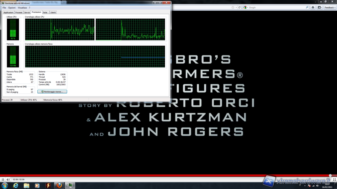 Abbiamo effettuato il primo test utilizzando Internet Explorer 8 e come si può vedere l’utilizzo della cpu si è risultato essere del 90/100% in alcuni casi, nonostante ciò non abbiamo riscontrato rallentamenti o blocchi durante l’esecuzione del filmato a tutto schermo.